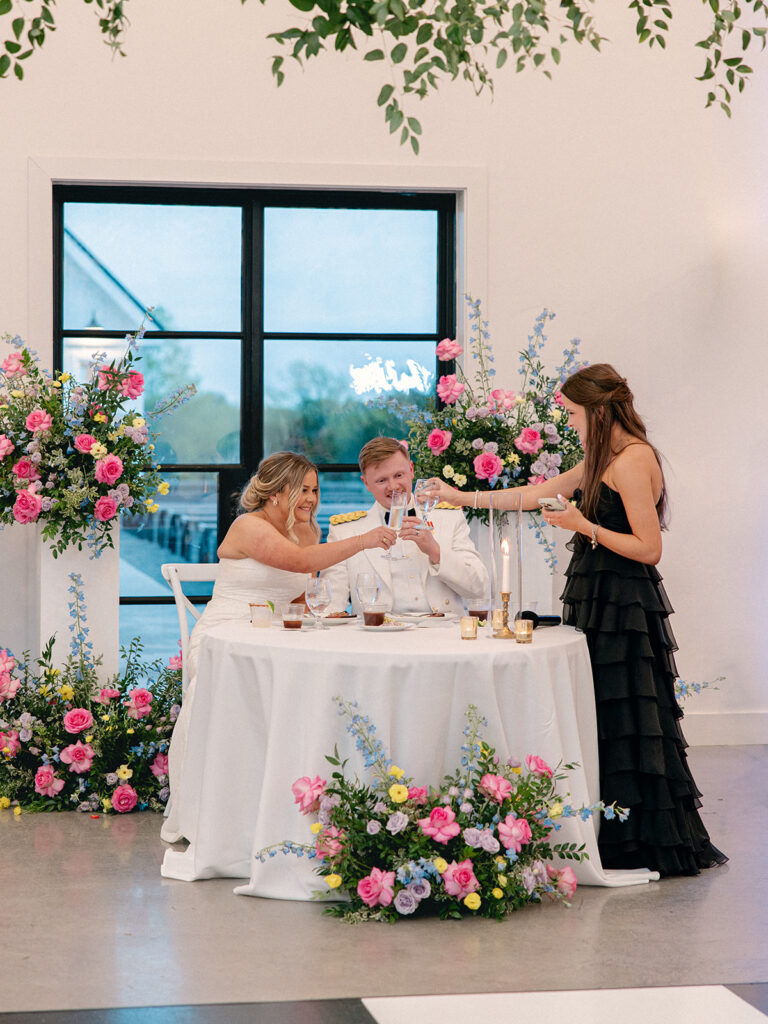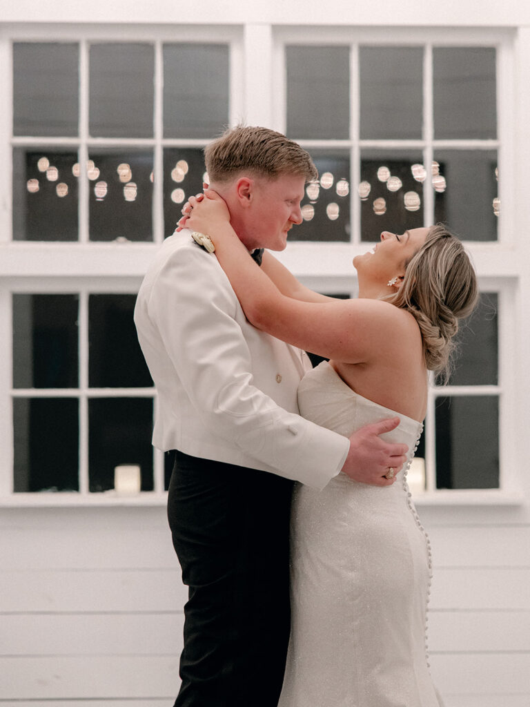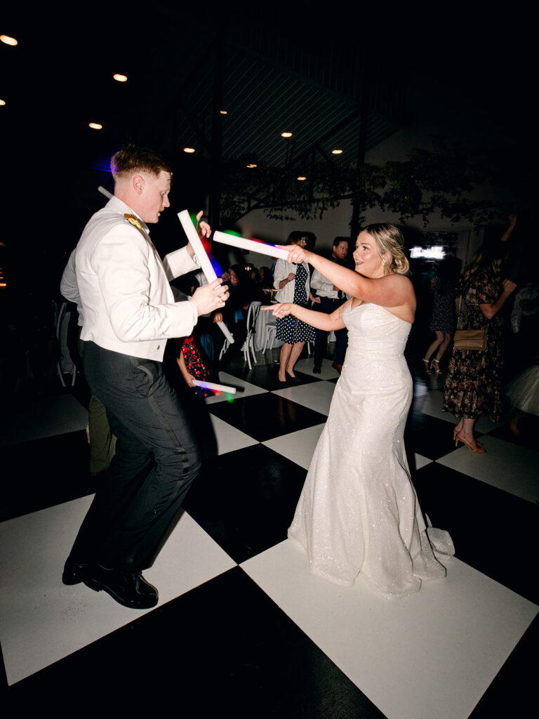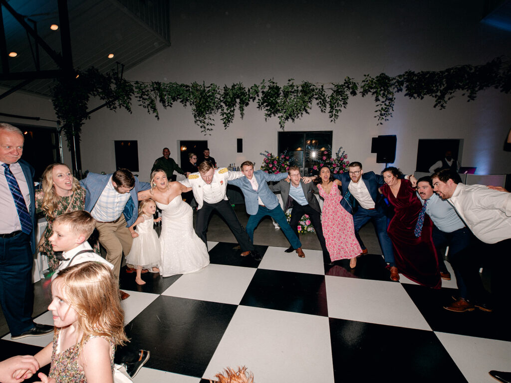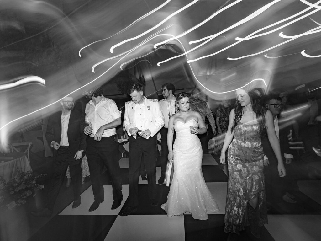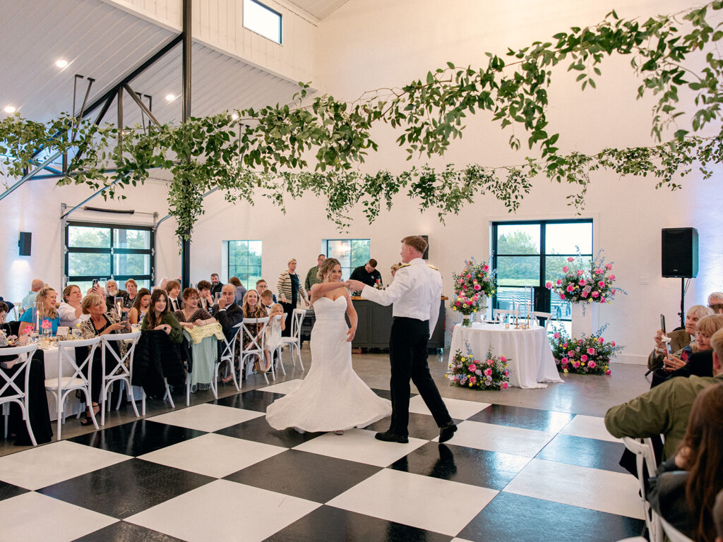 Alex and Kaitlyn added a custom black and white checkered dance floor—and I’ll say it again: custom floors matter. They give your reception a defined space, visual texture, and a ton of style. The bold pattern paired perfectly with their sleek aesthetic, and it photographed beautifully.