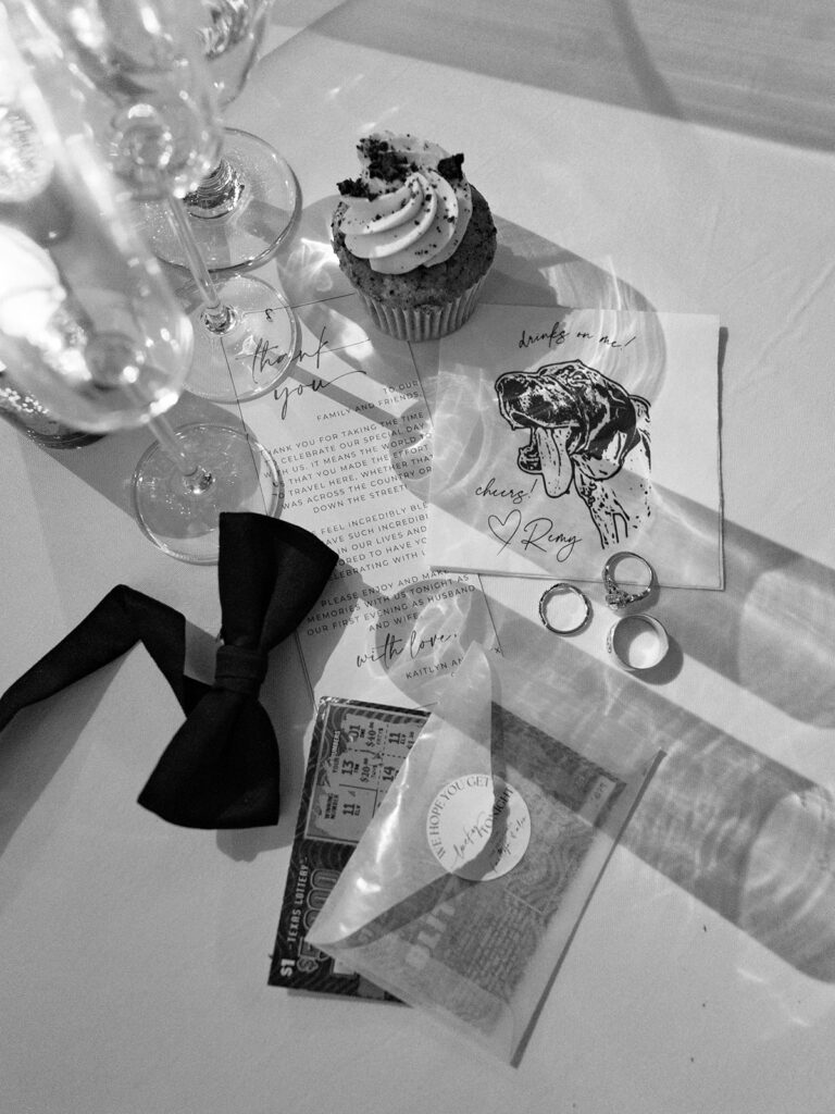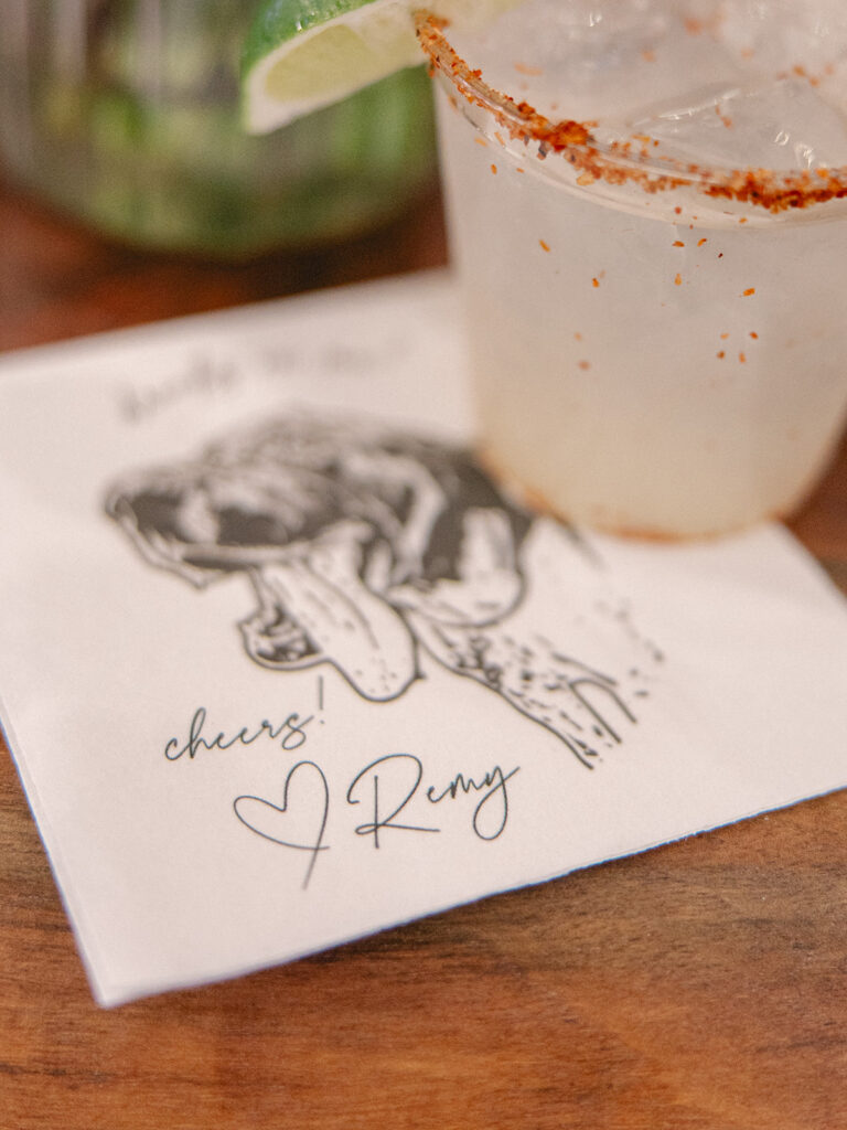Remy the dog didn’t attend the wedding, but he still made an appearance. His cute little face was printed on the cocktail napkins and there was a small Remy figurine on the wedding cake by Sweet Boom Bakery. It was the perfect personal touch. See the photos below 🙂