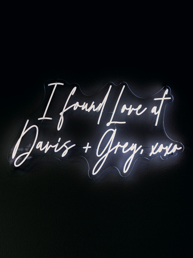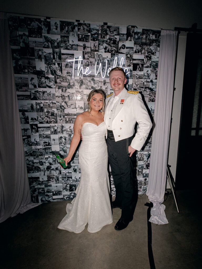 Right next to the dance floor was one of my favorite photo booth setups. Rather than going the traditional route, the couple created a full accent wall of black and white prints from throughout their relationship. The images framed a glowing neon sign that read The Webbs in script. Guests took photos in front of it all night long, and it felt personal, intentional, and full of character.