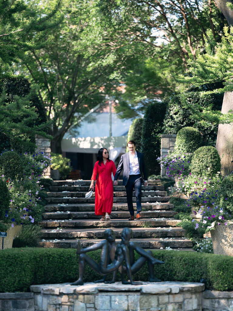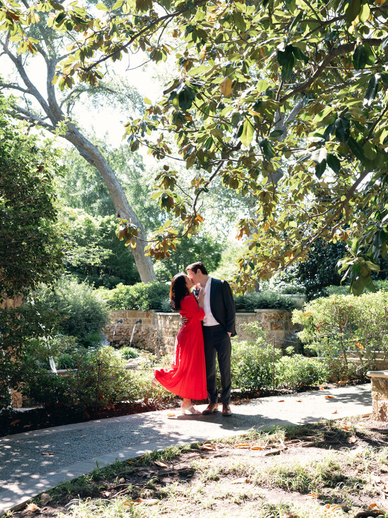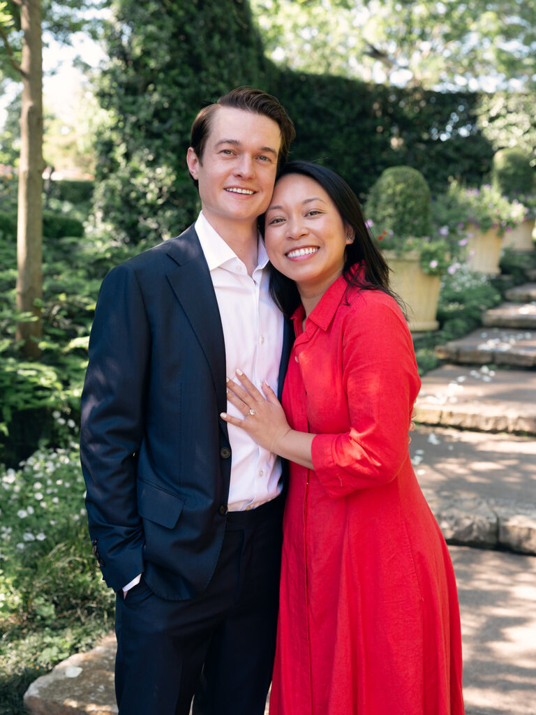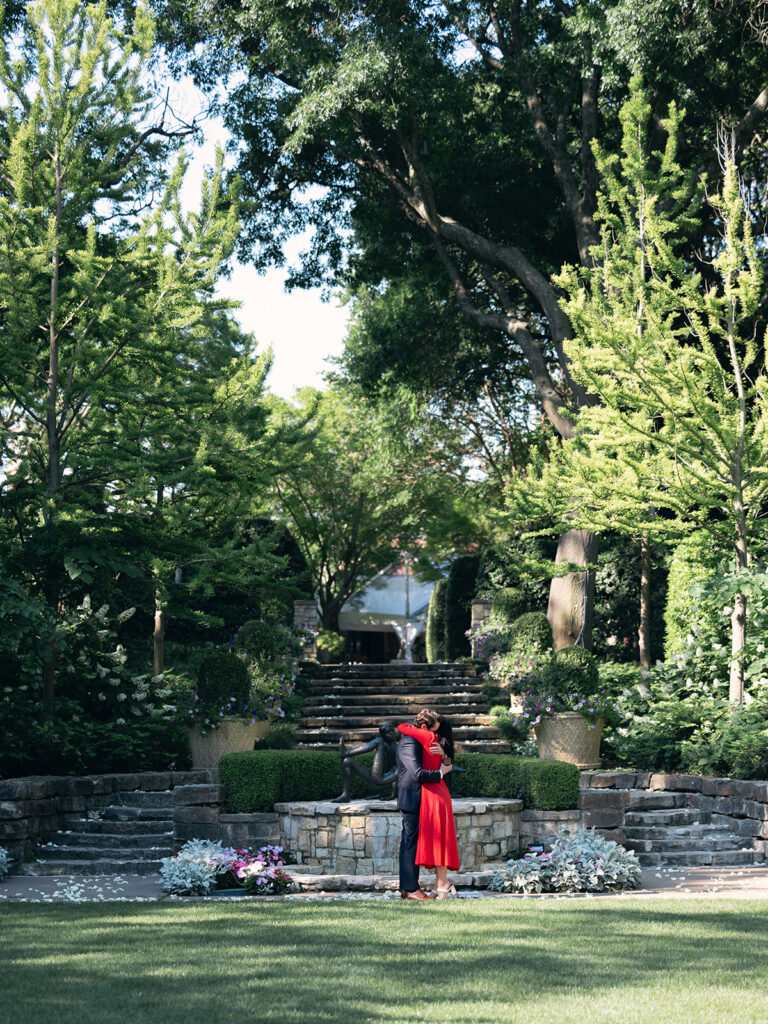 Jake and Isabel’s proposal at the Dallas Arboretum and Botanical Garden was one I will remember forever! With spring in full bloom and blue skies above, this story had the perfect combination of planning, surprise, and joy. Jake found my name on the Arboretum’s preferred vendors list and reached out wanting to plan a surprise proposal for Isabel. We talked through several ideas, but he ultimately chose the Sunken Garden—a tucked-away gem that feels private and romantic.