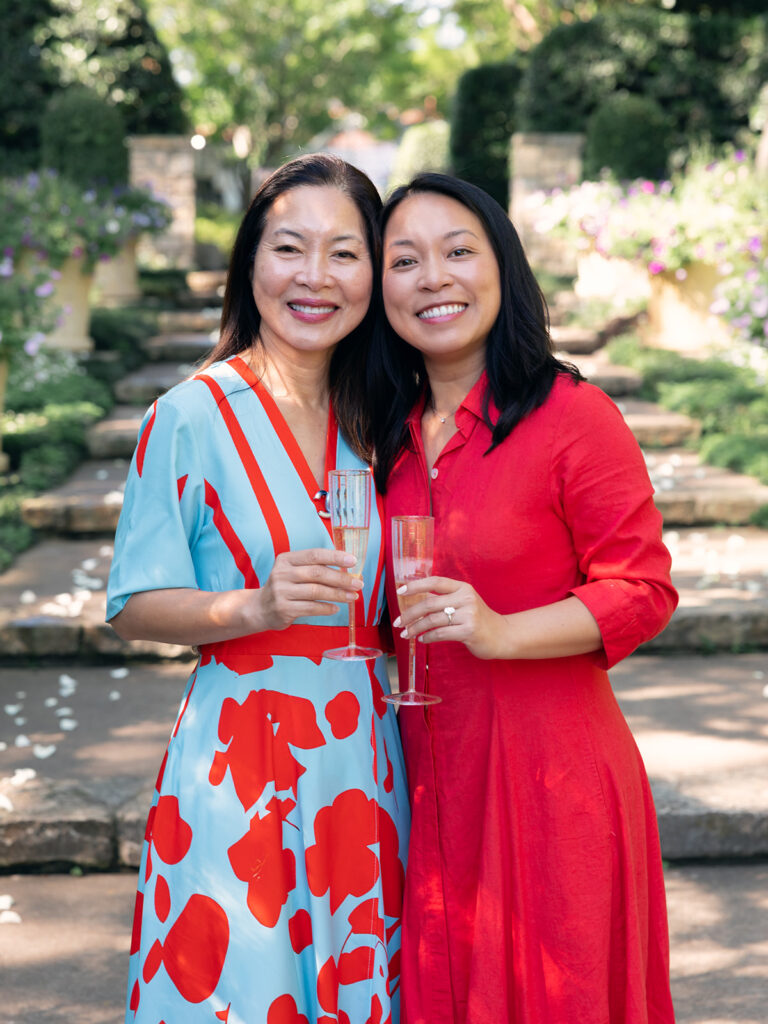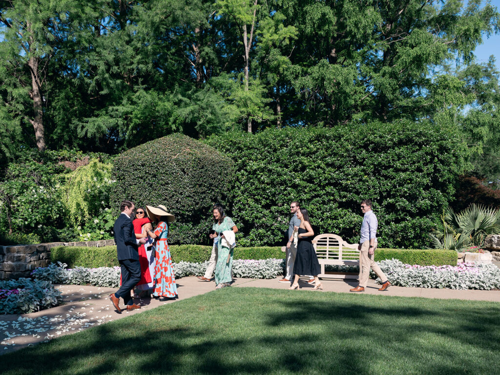 I arrived 45 minutes early to get parked, grab my entrance ticket, and make my way to the garden. I met up with some of the family at the gate, and we all walked in together. The Sunken Garden was already being roped off by Arboretum staff, and the family began setting the scene. They laid white rose petals along the path, brought champagne for a toast, and even had press-on nails in case Isabel noticed hers weren’t done. (Major sister win.)