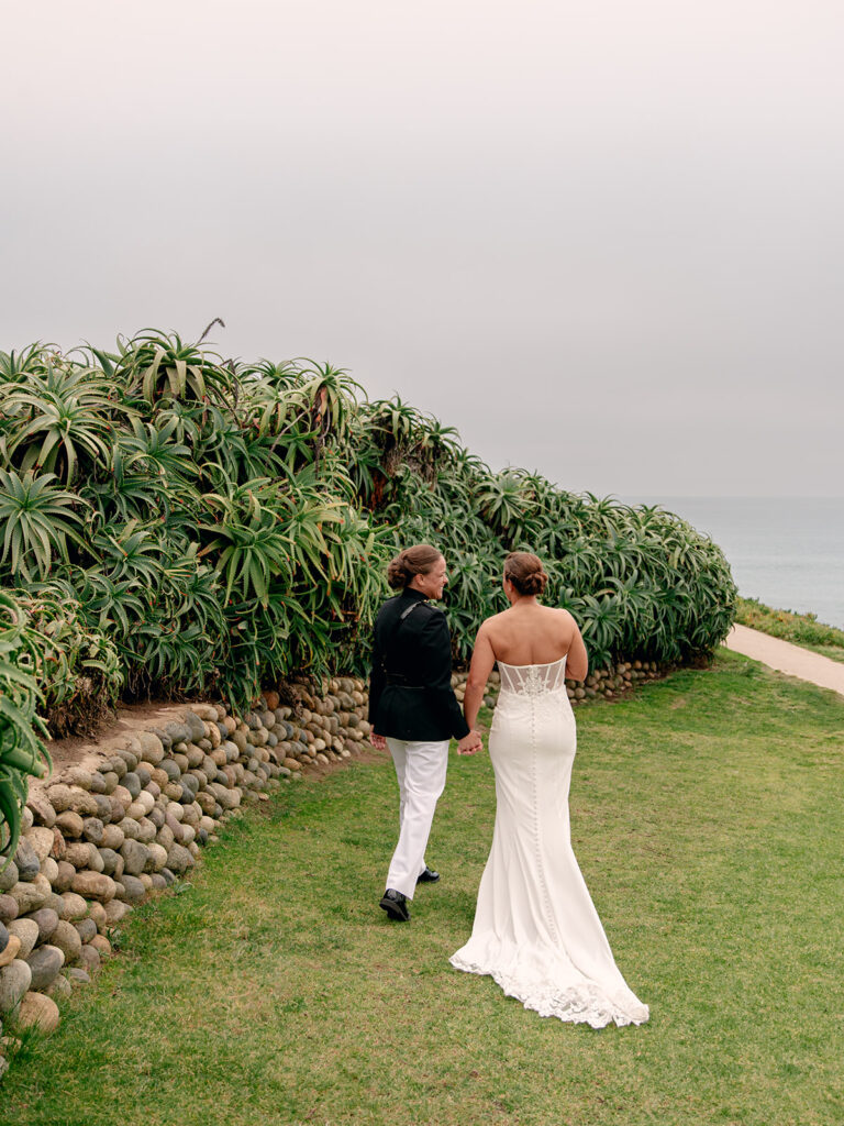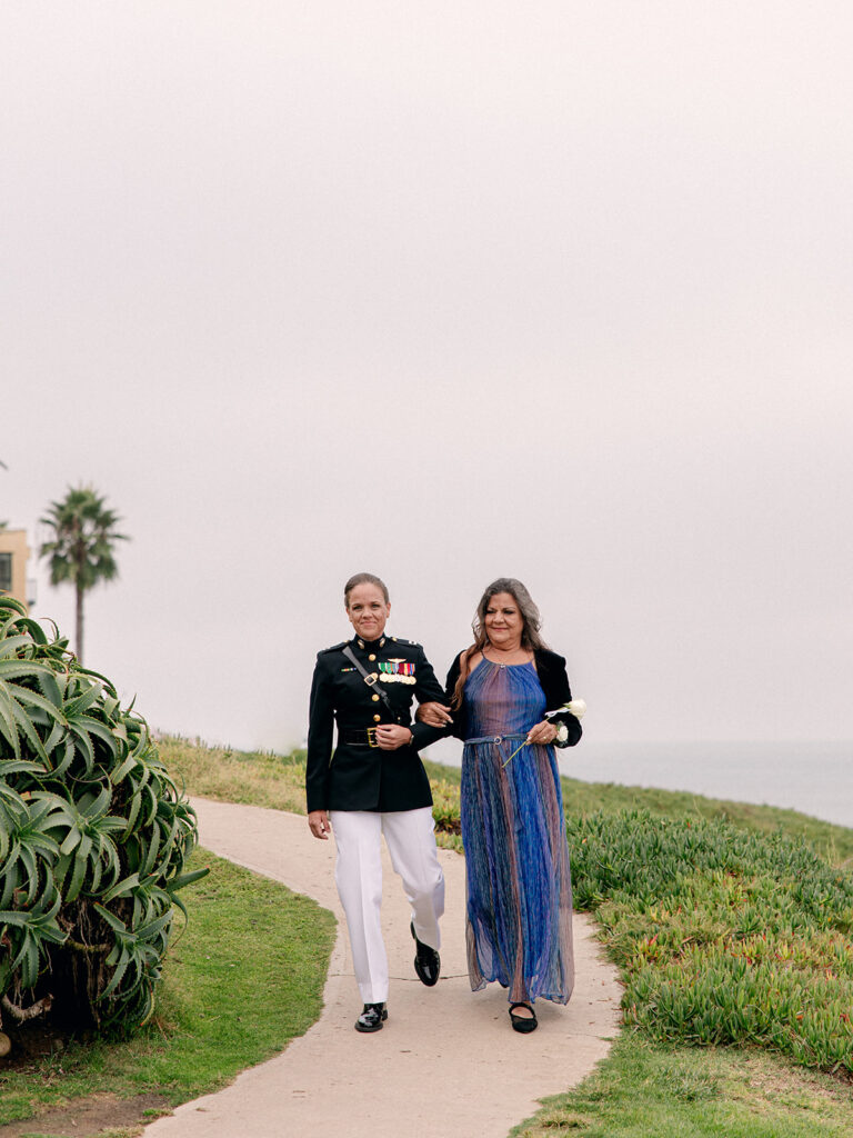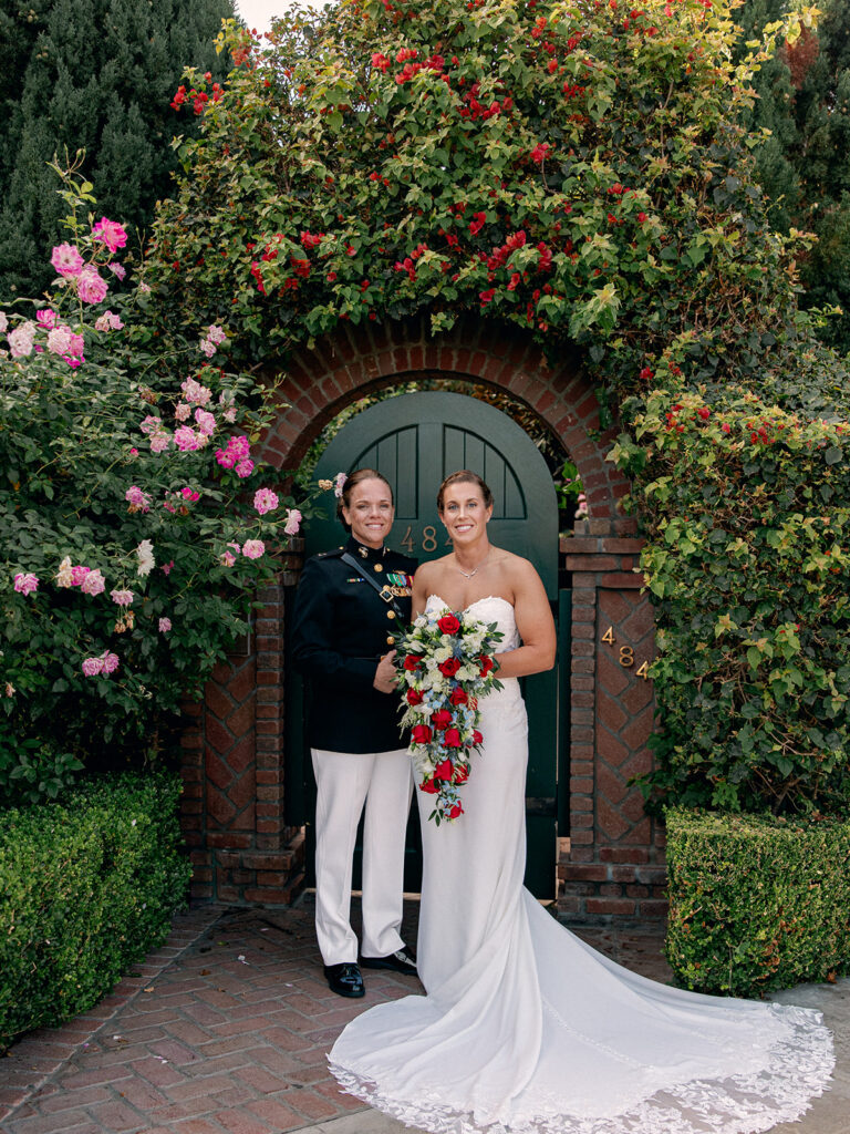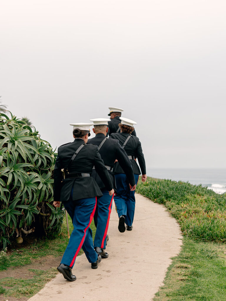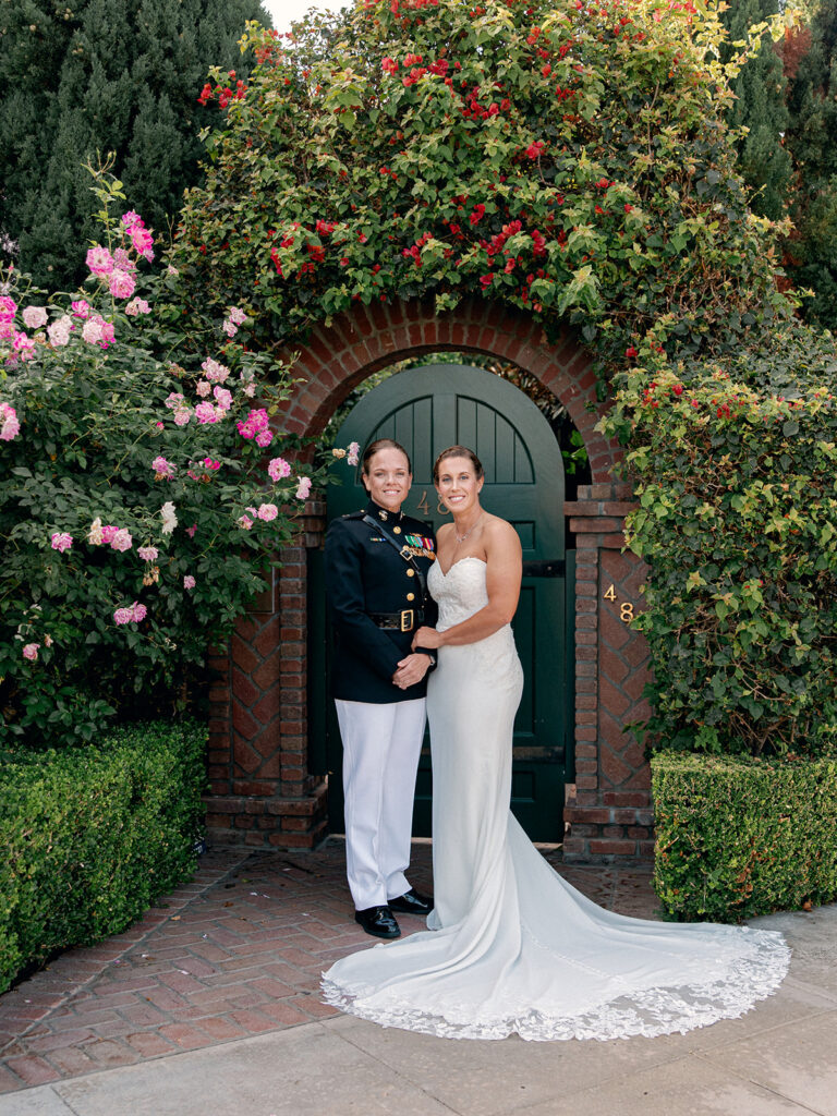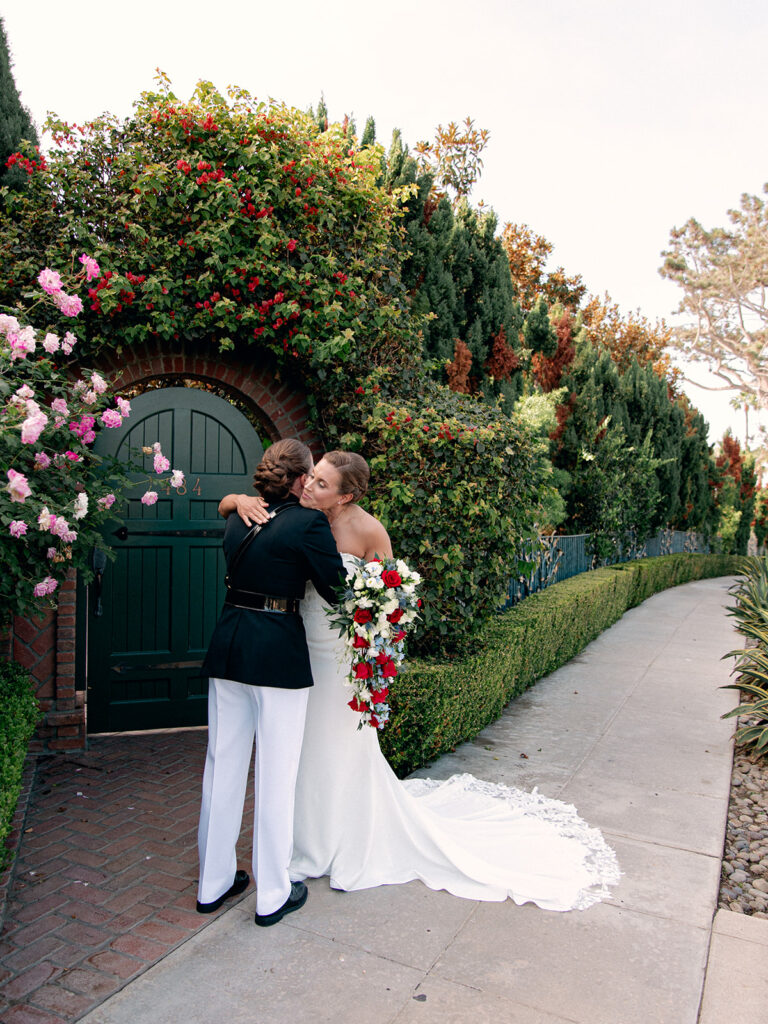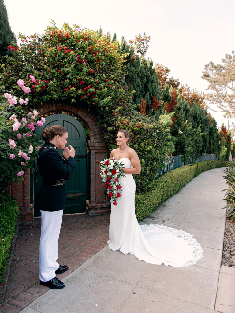The morning of the wedding, after a peaceful beachside run, we joined Mehgan and Taylor at The Scripps Inn where they were getting ready. Mehgan wore her Marine Corps officer blues—a powerful and personal choice—while Taylor wore a stunning, form-fitting white wedding dress. Their first look was right outside the inn, framed by a doorway wrapped in greenery and florals. The California sun peeked out at just the right moment, creating a golden glow that felt like magic.