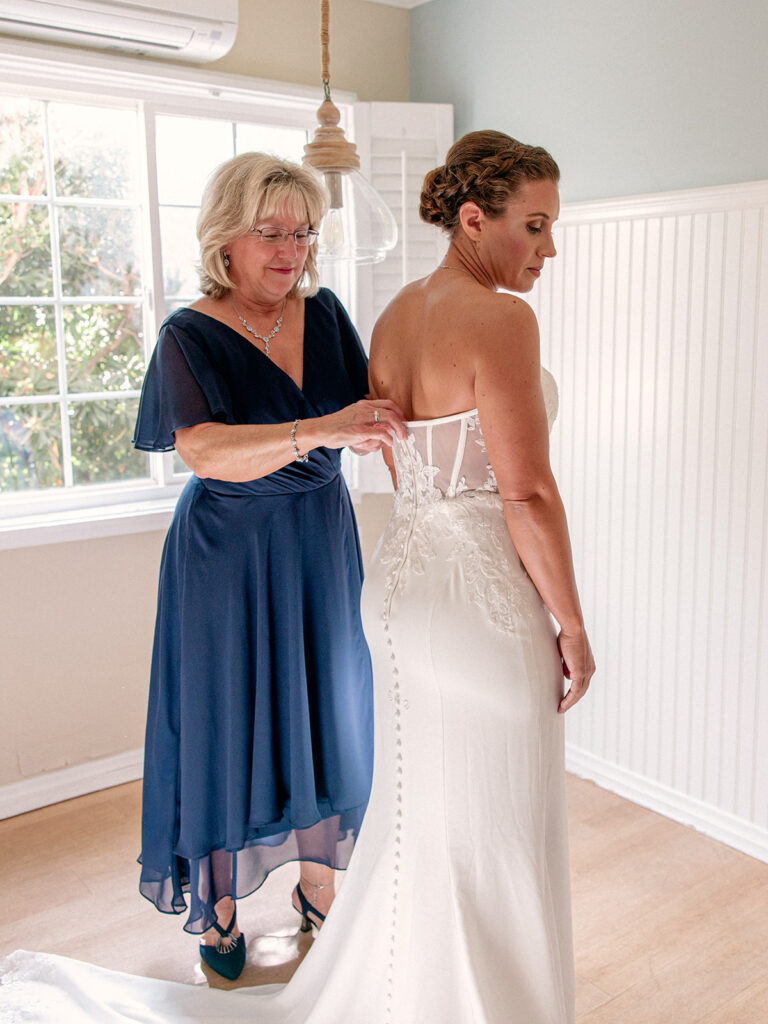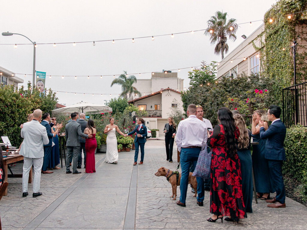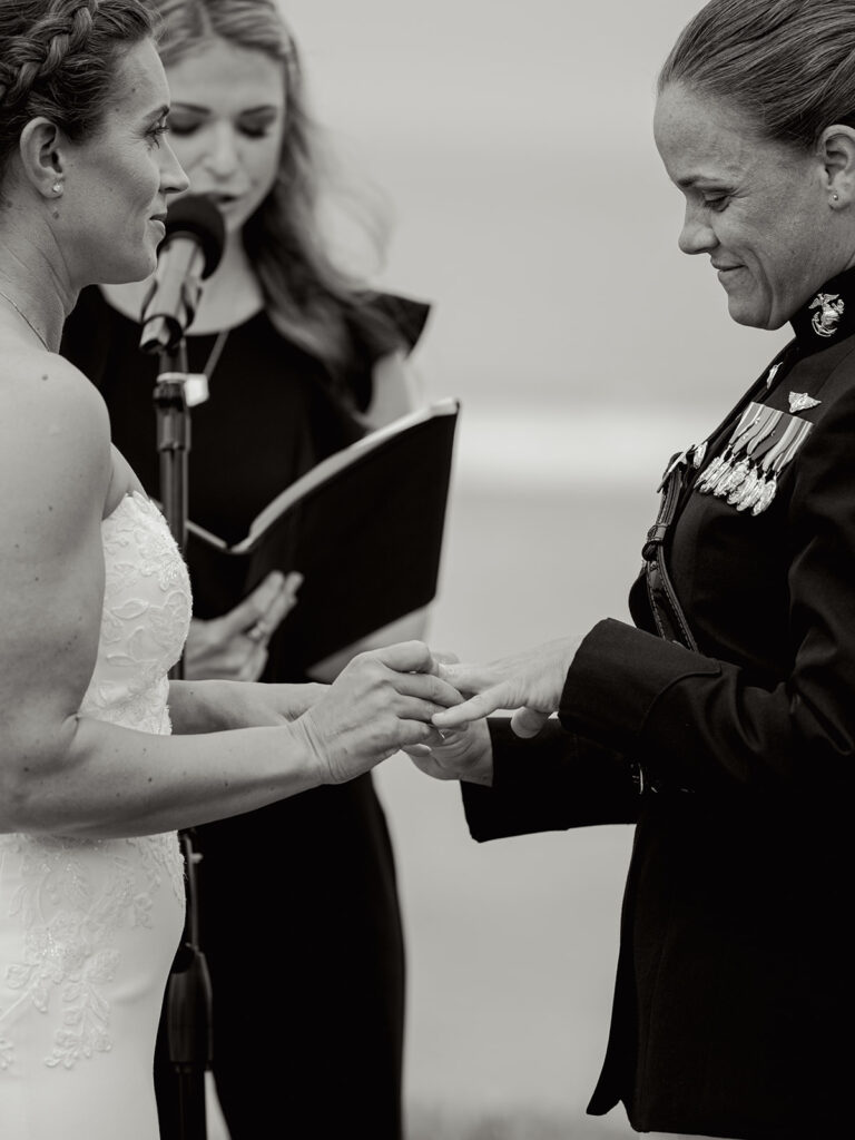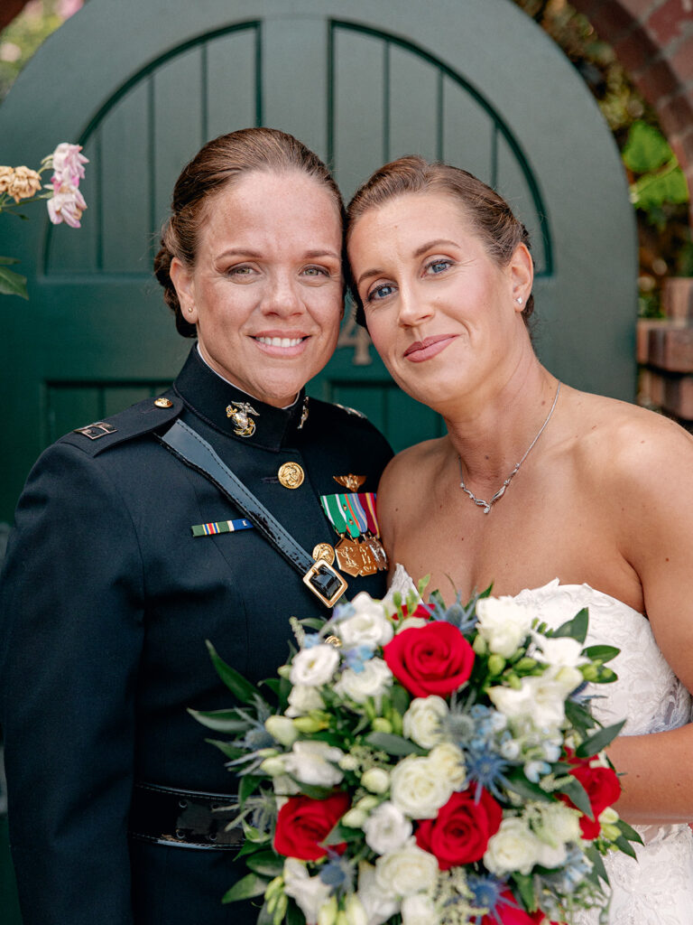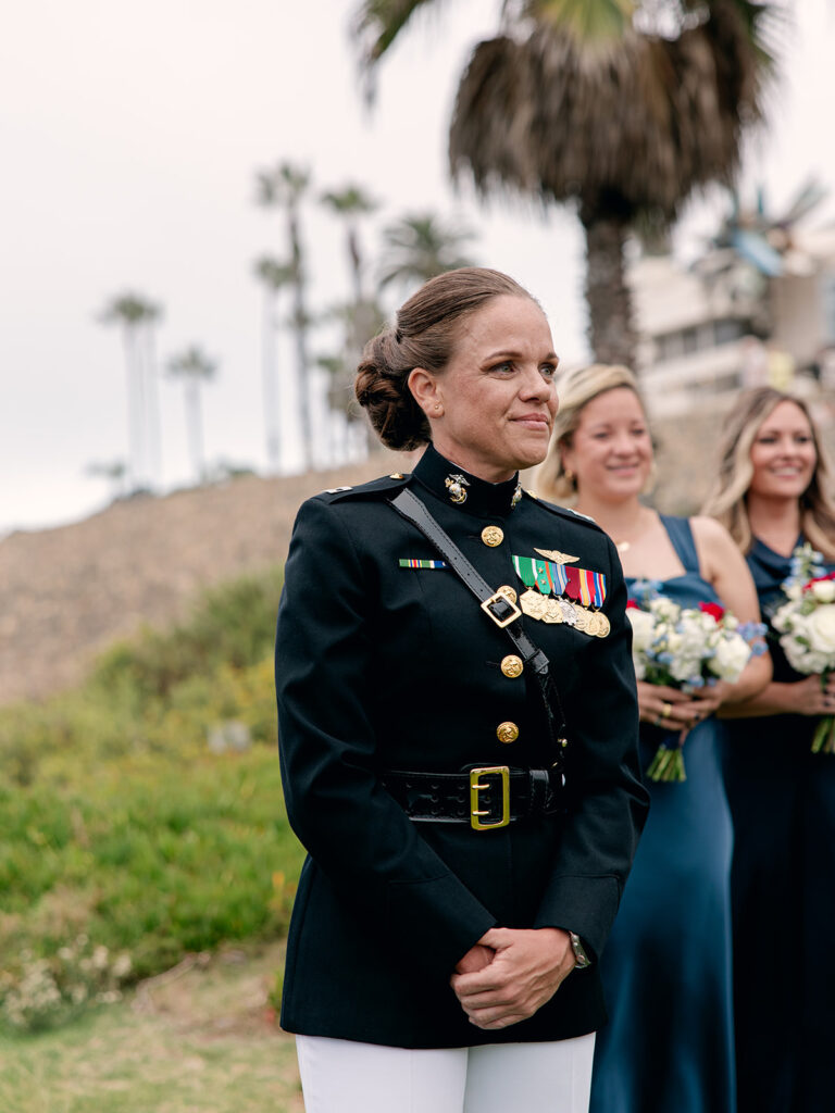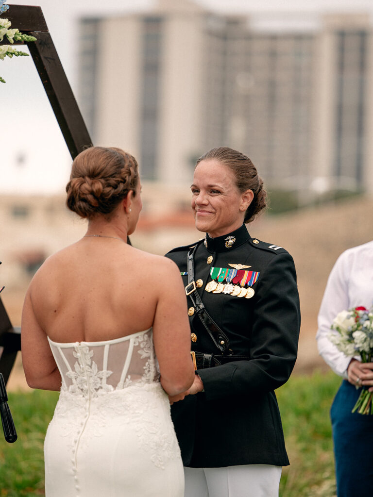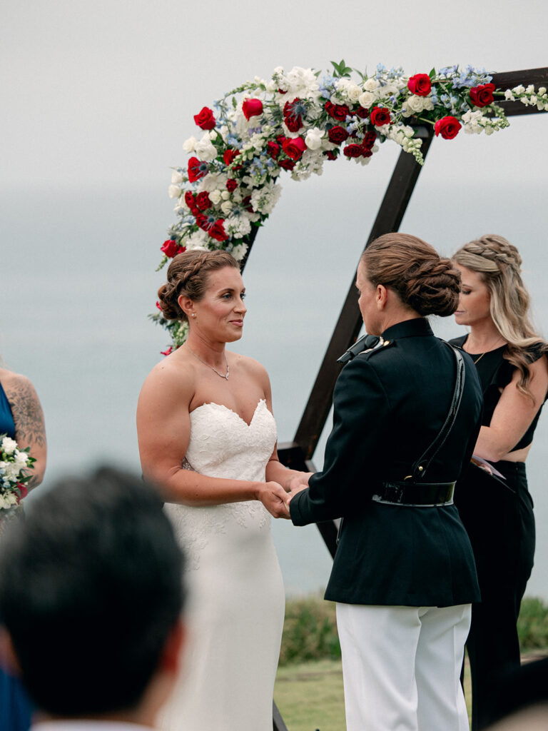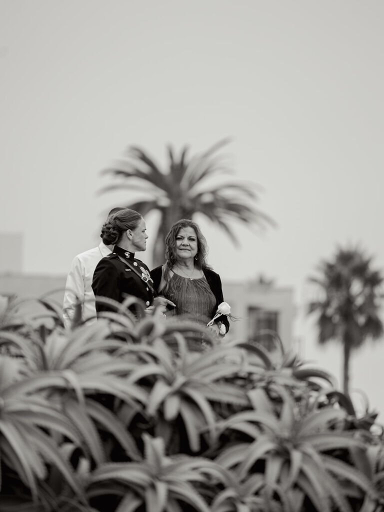 The morning of the wedding, after a peaceful beachside run, we joined Mehgan and Taylor at The Scripps Inn where they were getting ready. Mehgan wore her Marine Corps officer blues—a powerful and personal choice—while Taylor wore a stunning, form-fitting white wedding dress. Their first look was right outside the inn, framed by a doorway wrapped in greenery and florals. The California sun peeked out at just the right moment, creating a golden glow that felt like magic.