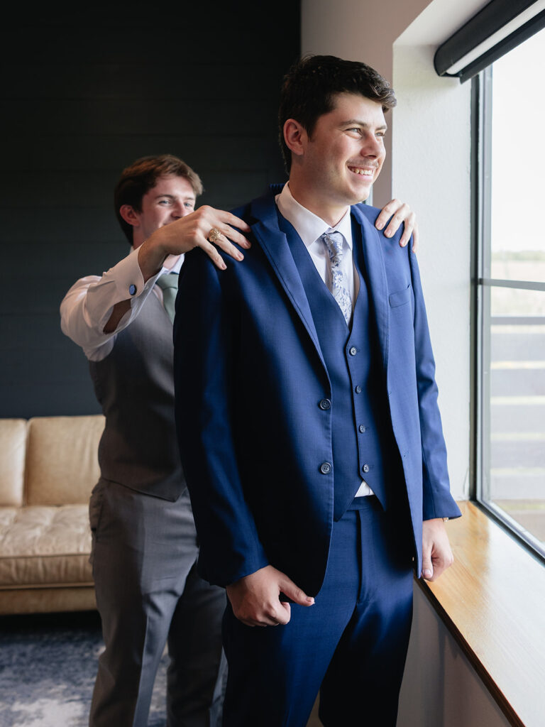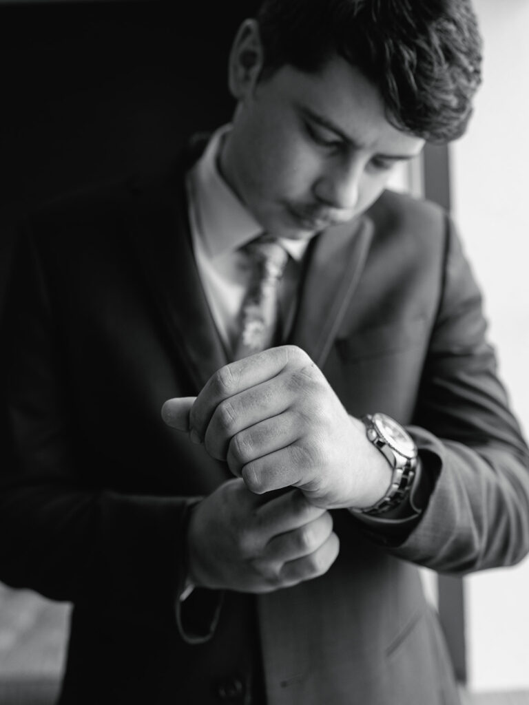 Meanwhile, Josh and his groomsmen brought an entirely different kind of energy to their morning—laid-back and full of “game day” spirit as they suited up in the groom’s suite.