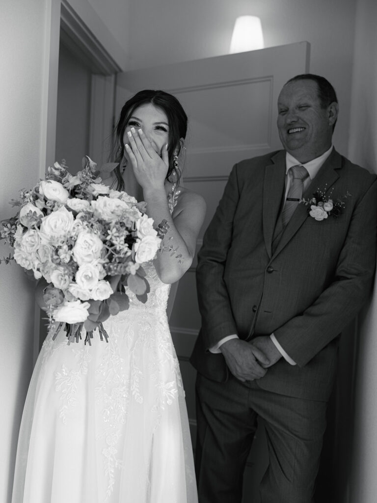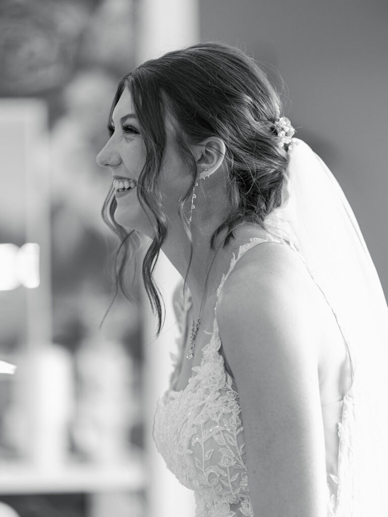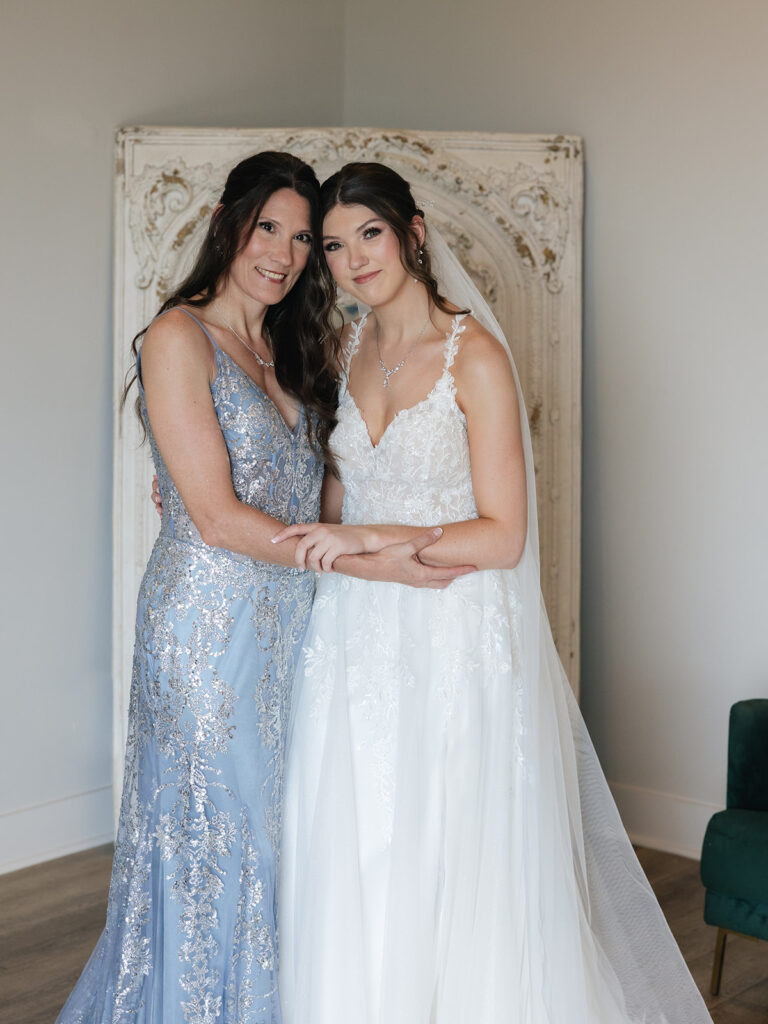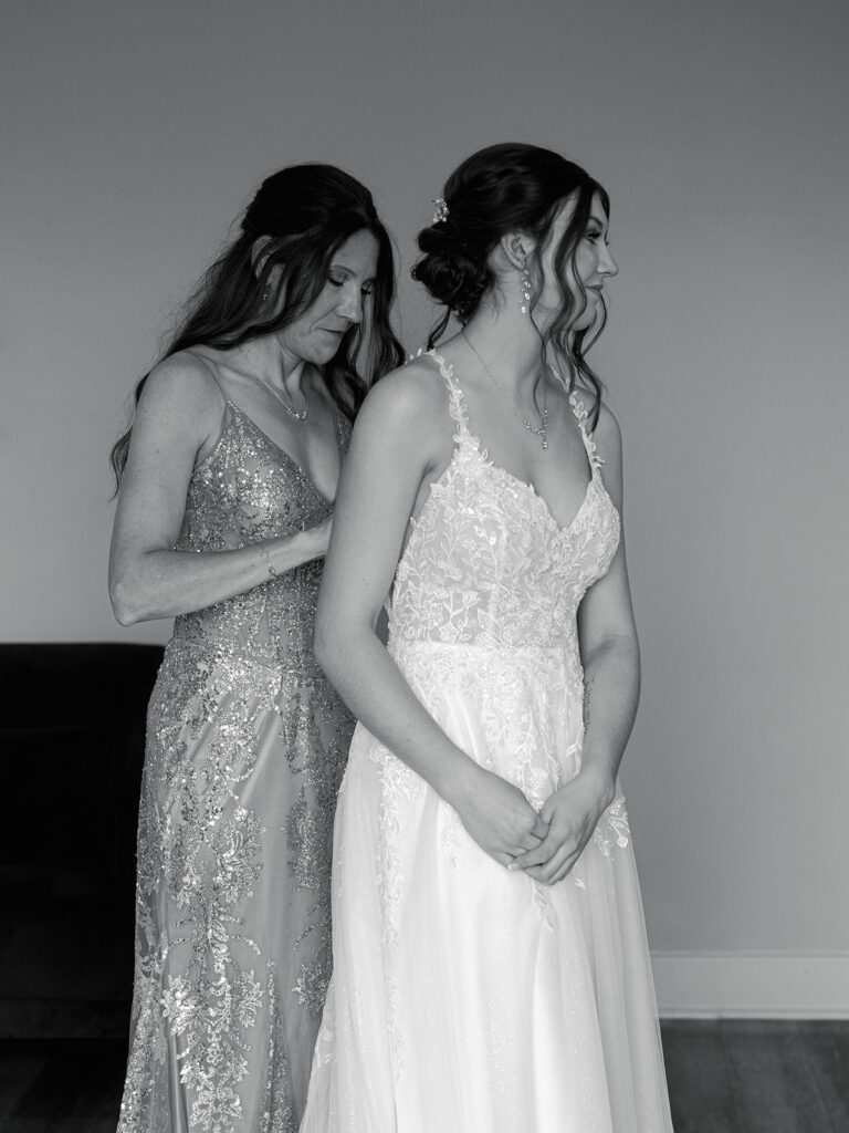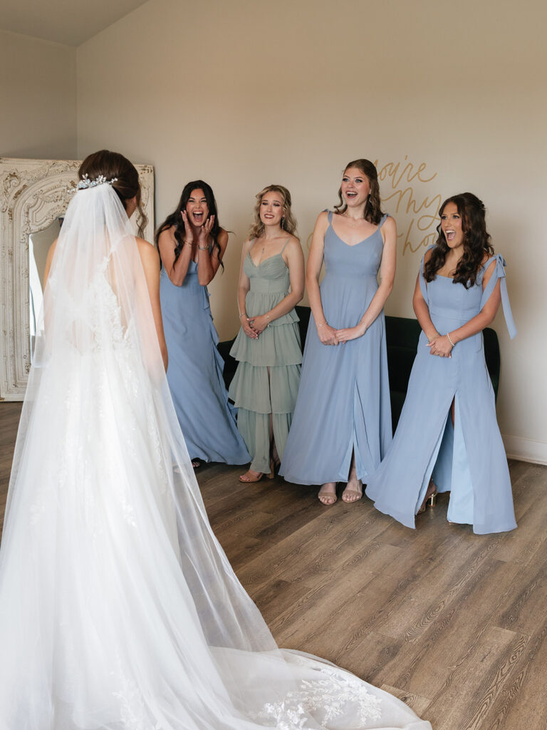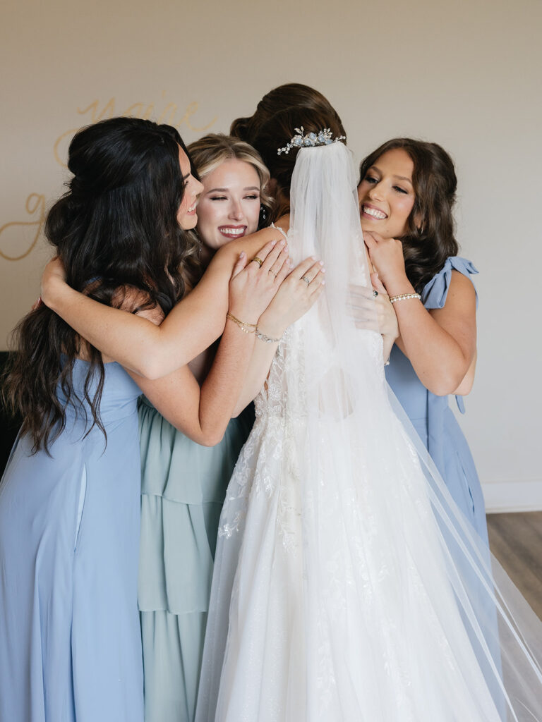 The morning started with laughter, matching PJs, and heartfelt moments as Alyssa and her bridesmaids got ready. Her mom helped her into her wedding dress (from Sara’s Bridal Boutique) while her bridesmaids waited for the big reveal. The room was full of excitement as Alyssa turned to show them her dress for the first time.