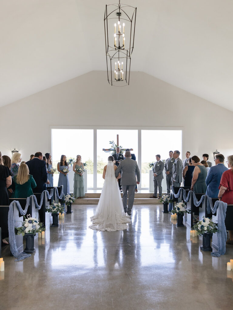 The indoor chapel at Davis & Grey Farms never disappoints. Its bright white interior, tall windows, and dramatic black sliding doors create a space that feels both intimate and grand.