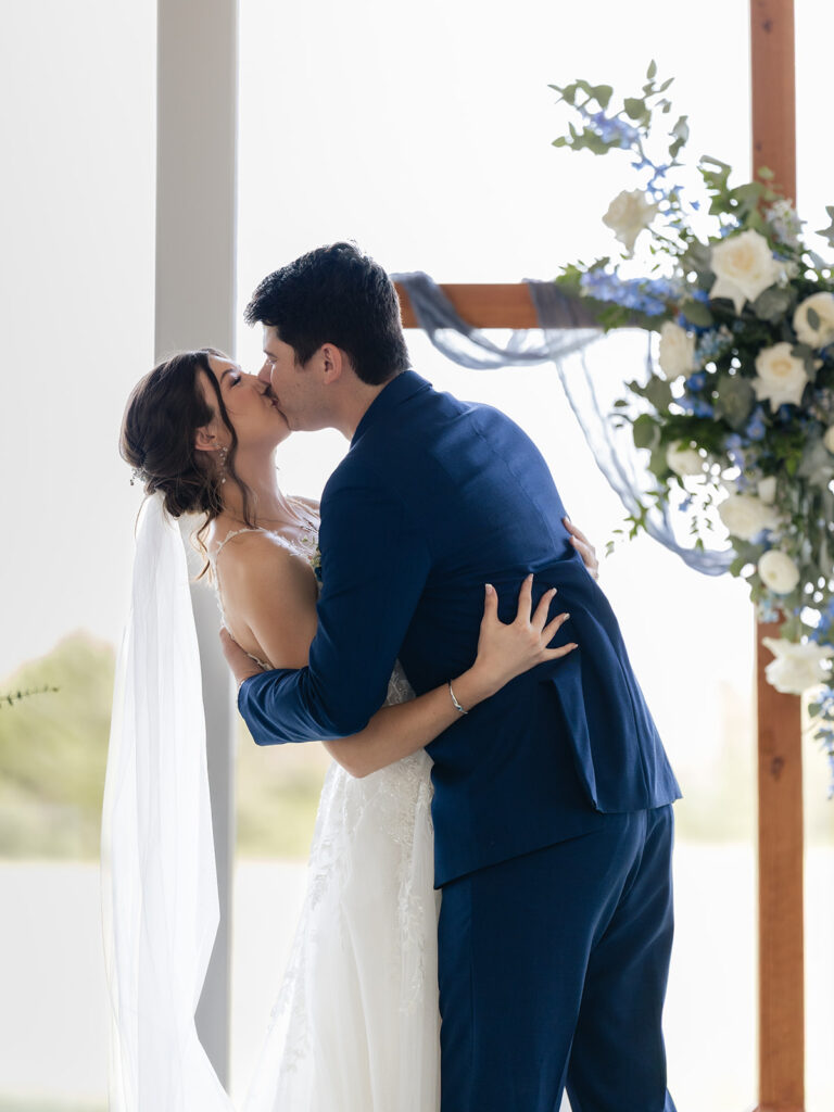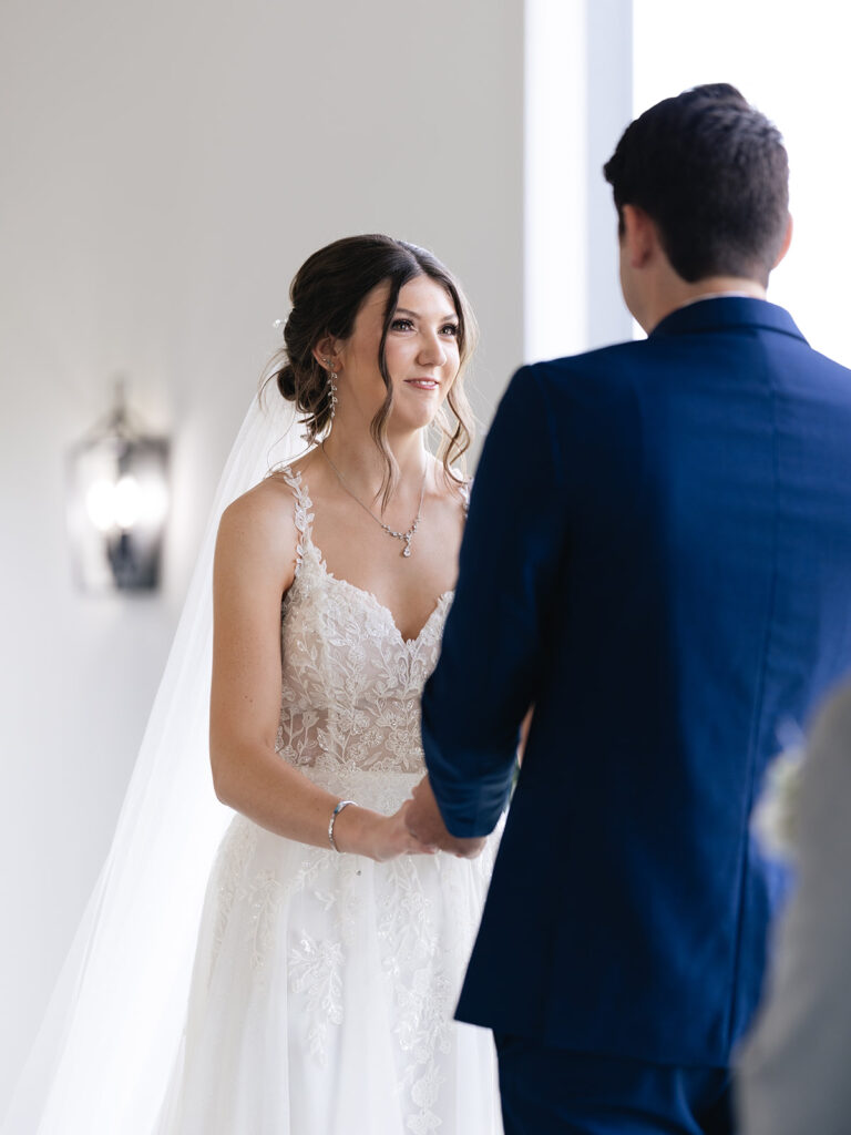 Their ceremony was heartfelt and personal, including a unity braid that symbolized their marriage’s strength and faith. The soft blues and greens of their florals by Haute Poppies Floral added an elegant pop of color against the neutral space.