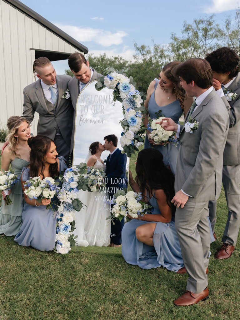 One of my favorite images from the day is the creative group photo inspired by their welcome mirror, surrounded by their bridal party—a fun, joyful moment that perfectly captured their personalities.