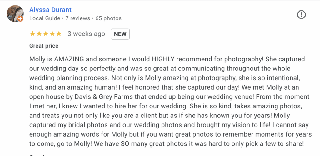 Alyssa shared the kindest words on a google review after their wedding day: